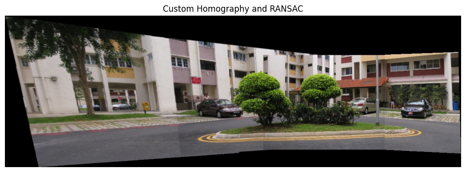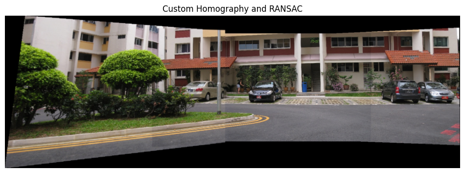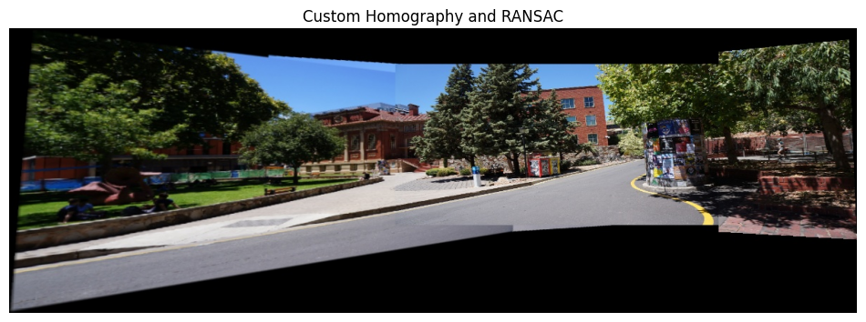 show_image(BGR2RGB(custom), w=12, h=6, title='Custom Homography and RANSAC')