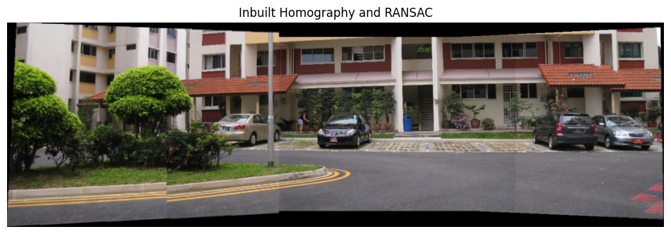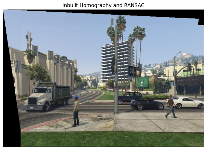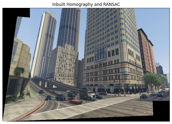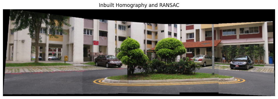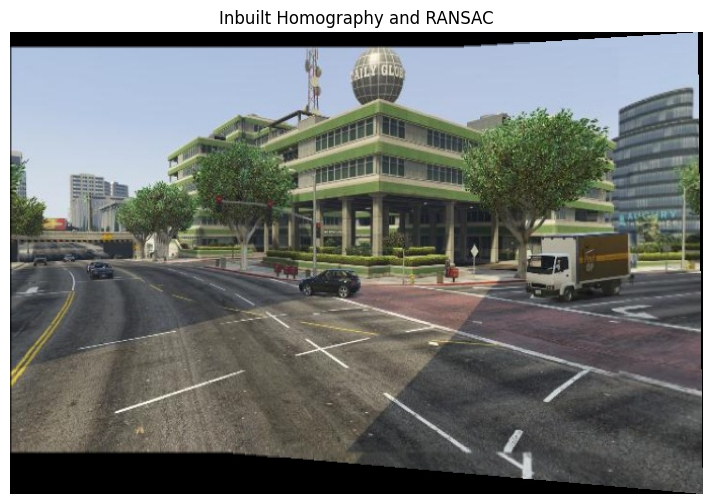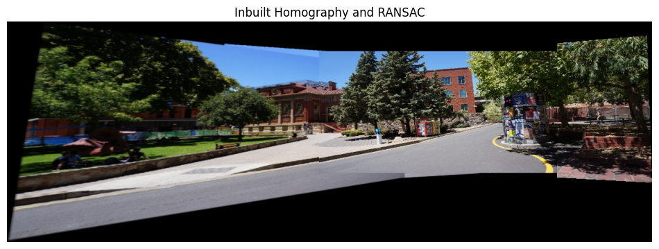show_image(BGR2RGB(inbuilt), w=12, h=6, title='Inbuilt Homography and RANSAC')
