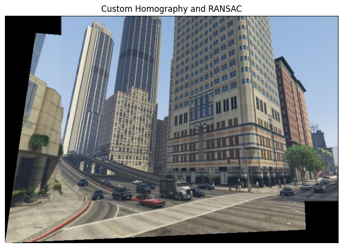 The image obtained through a custom implementation of homography computation and RANSAC looks similar to the image obtained through the built-in function for homography estimation.